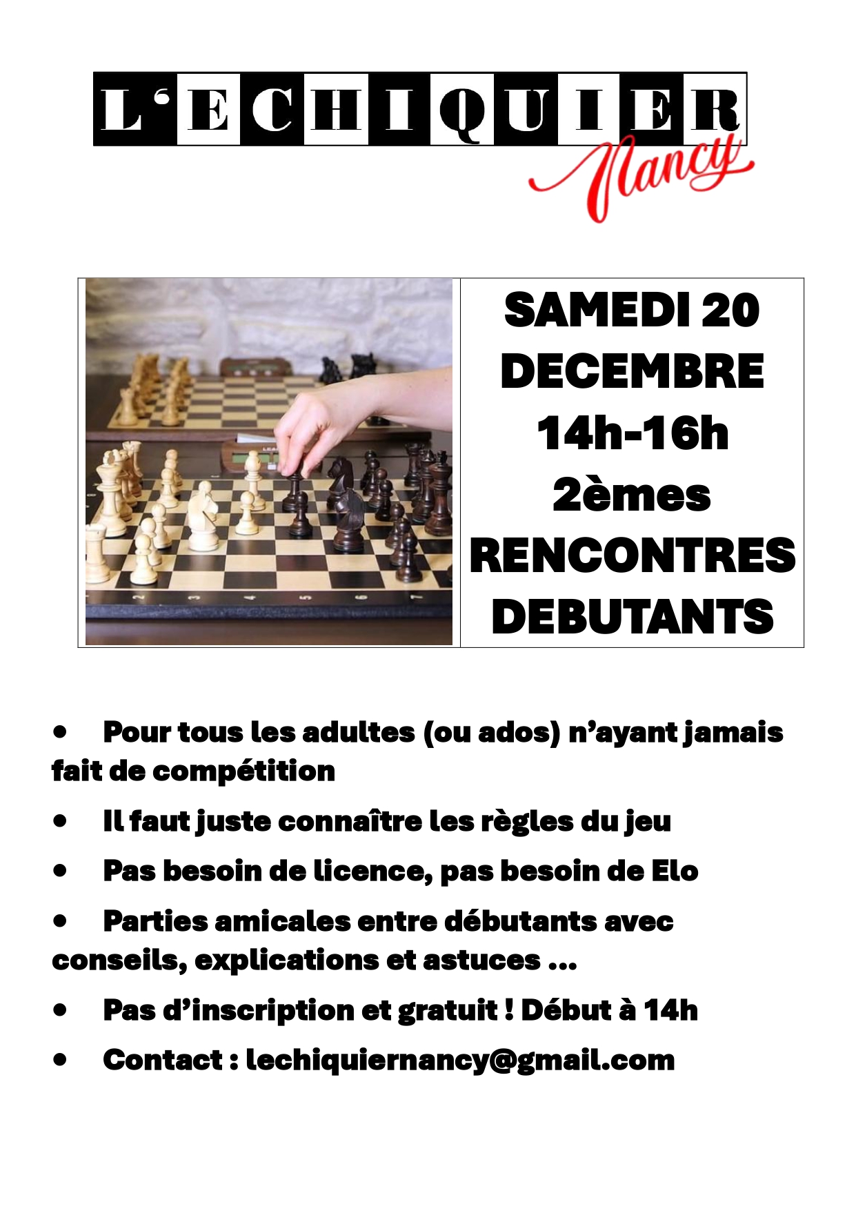 * Samedi 20 décembre de 14h à 16h : 2èmes rencontres « débutants », 100% gratuites, parties amicales entre débutants (pas besoin de licence, pas besoin de Elo !), avec conseils, explications et astuces entre chaque ronde… Pas d’inscription, il suffit de venir à 14h 🙂 Ici l’affiche.